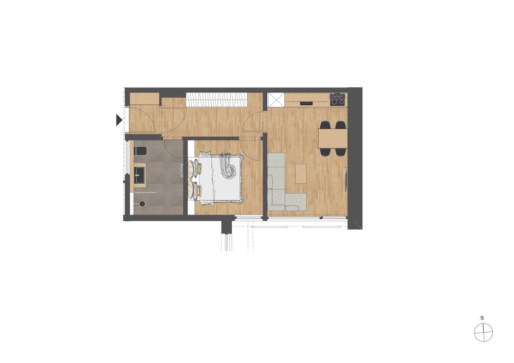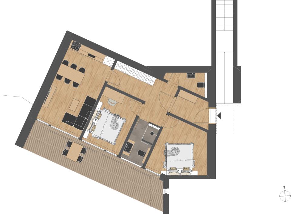 Nabízí velkorysý prostor pro stolování i odpočinek po dni na horách. Jejím hlavním prvkem je prostorná soukromá terasa s grilem, která rozšiřuje obývací prostor ven a nabízí místo pro klidné snídaně i posezení pod hvězdami.