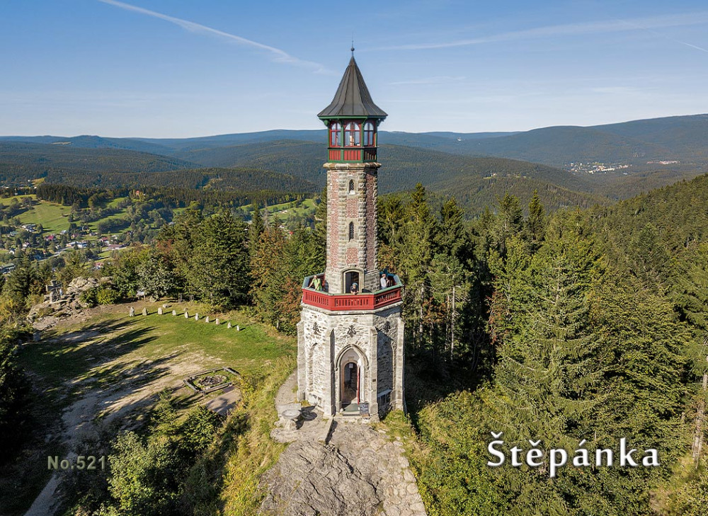 Přímo nad námi se tyčí Štěpánka, nejstarší a podle mnohých nejkrásnější rozhledna Jizerek.